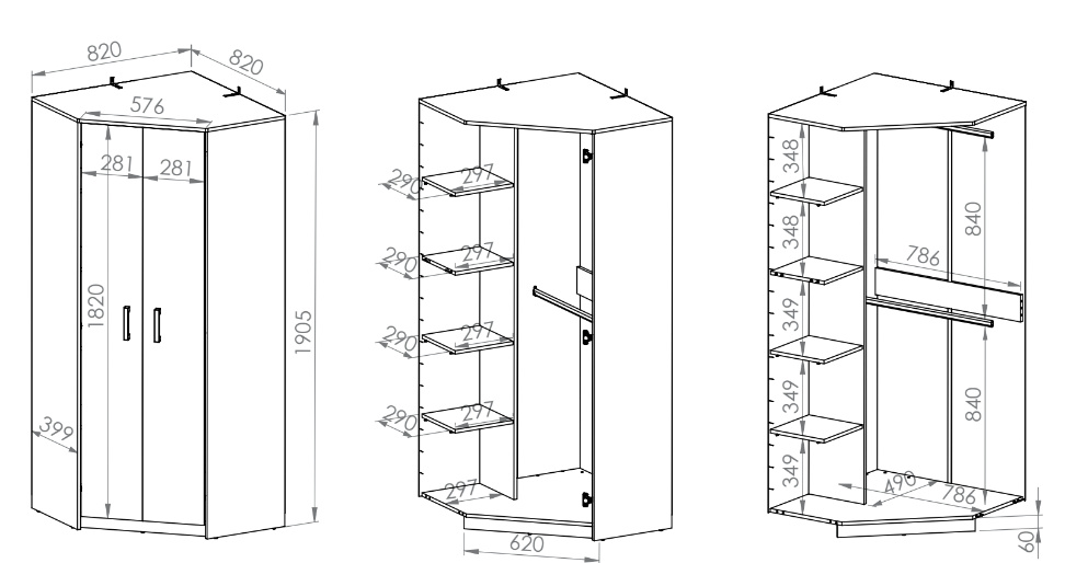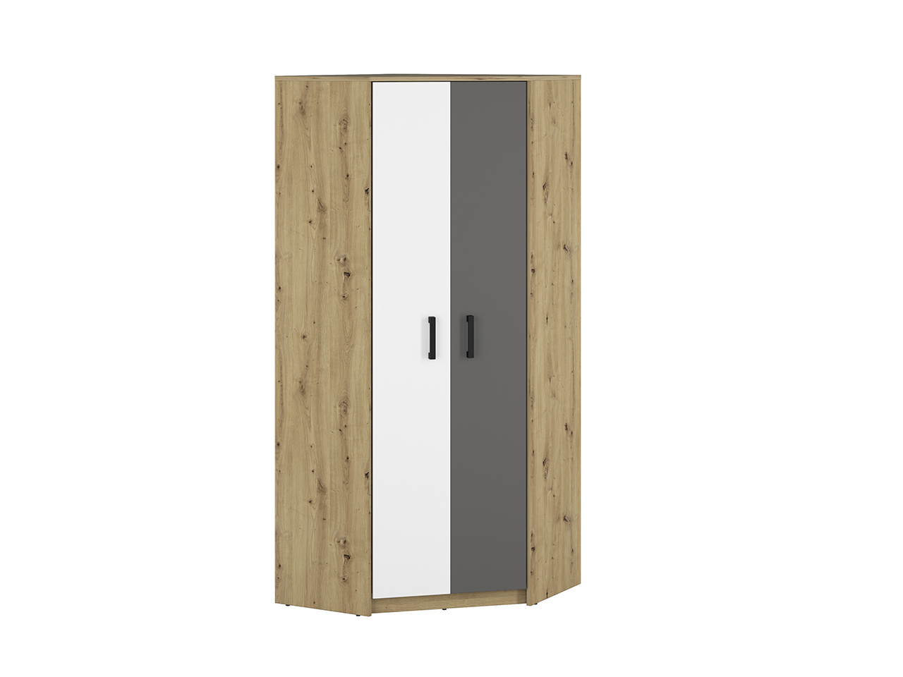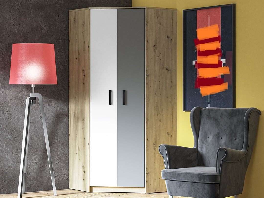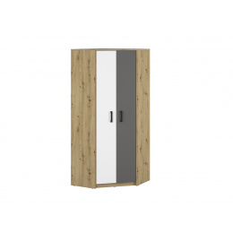 FINI 13 rohová šatní skříň - dvoudveřová, kombinovaná s policemi a šatními tyčemi nad sebou