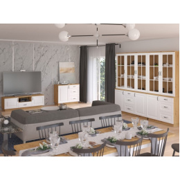 Obývací pokoj z nábytkového programu FLAMENCO se stane místem, kde si dokonale vychutnáte chvíle odpočinku v příjemném prostředí. Tato jedinečná kombinace dubu artisan/ bílá dodá interiéru lehkost a svěžest. Eleganci dodají sektorovému nábytku FLAMENCO kovové úchyty. Sektor FLAMENCO se skládá z 11 prvků, ze kterých si můžete vytvořit jedinečný vzhled jídelny nebo obývacího pokoje. Nábytek FLAMENCO je vyrobena z kvalitní MDF.