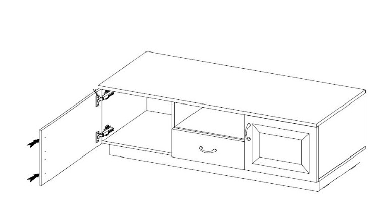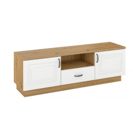Televizní stolek - po stranách dvoudvířkové skříňky s policemi, uprostřed šuplík a otevřená odkládací nika.