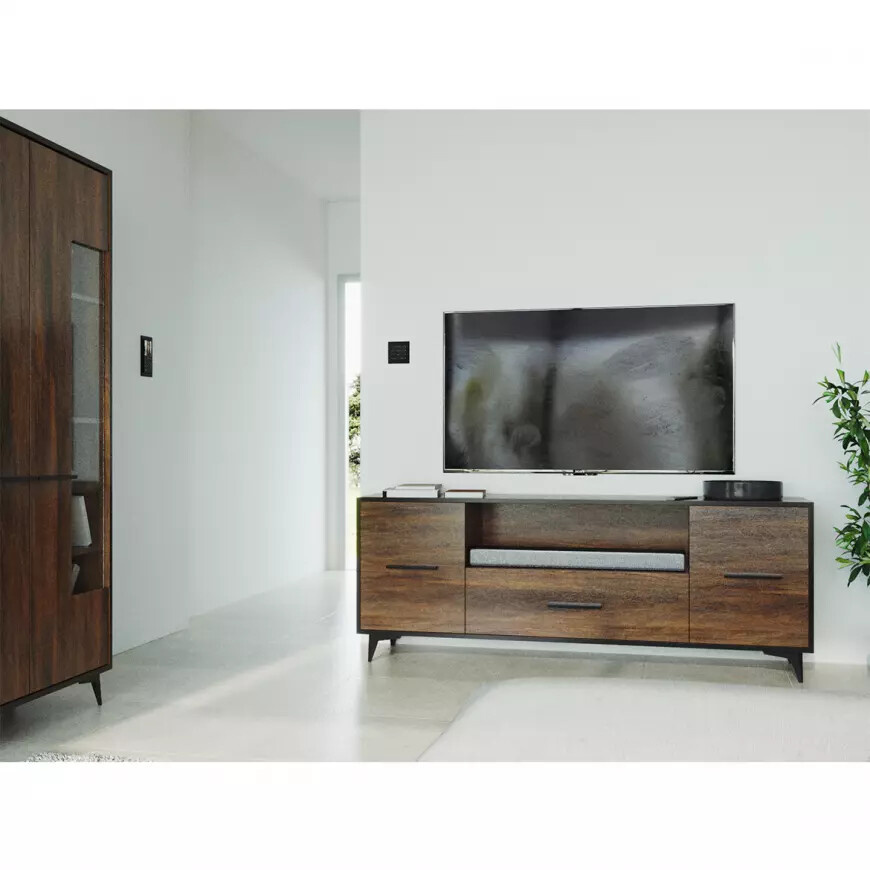Moderní nábytek nemusí znamenat strohý a minimalistický. Systémovým nábytkem FRIDA zařídíte obývací pokoj i ložnici v přírodních zemitých barvách. K sestavení vlastního interiéru budete mít 15 prvků. Nábytek je vyroben z kvalitního lamina v hřejivém barevném provedení Walnut s černým ohraněním a černými úchyty. Nábytek je postaven na nožičky v černé barvě, které jsou 12 cm vysoké