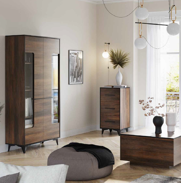 Moderní nábytek nemusí znamenat strohý a minimalistický. Systémovým nábytkem FRIDA zařídíte obývací pokoj i ložnici v přírodních zemitých barvách. K sestavení vlastního interiéru budete mít 15 prvků. Nábytek je vyroben z kvalitního lamina v hřejivém barevném provedení Walnut s černým ohraněním a černými úchyty. Nábytek je postaven na nožičky v černé barvě, které jsou 12 cm vysoké