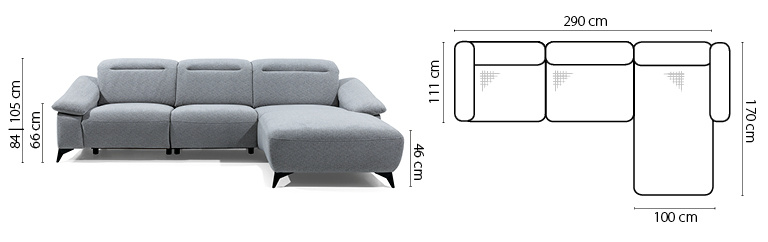 Moderní, prostorná, pohodlná rohová sedací souprava se sklápěcím jednosedákem a polohovacími záhlavníky . U rohovky je kladen důraz na pohodlí sezení. Základem sedáku jsou vinuté pružiny a kvalitní PUR pěna, která zajistí pohodlné sezení. Velký výběr potahových látek je samozřejmostí. Sedací souprava je vybavena relaxační funkcí elektrického sklápění, kterou aktivujete jednoduchým stisknutím tlačítka na boční straně.