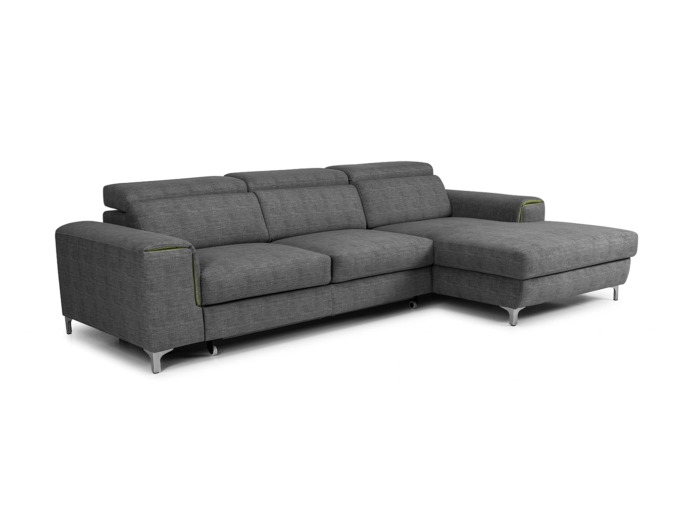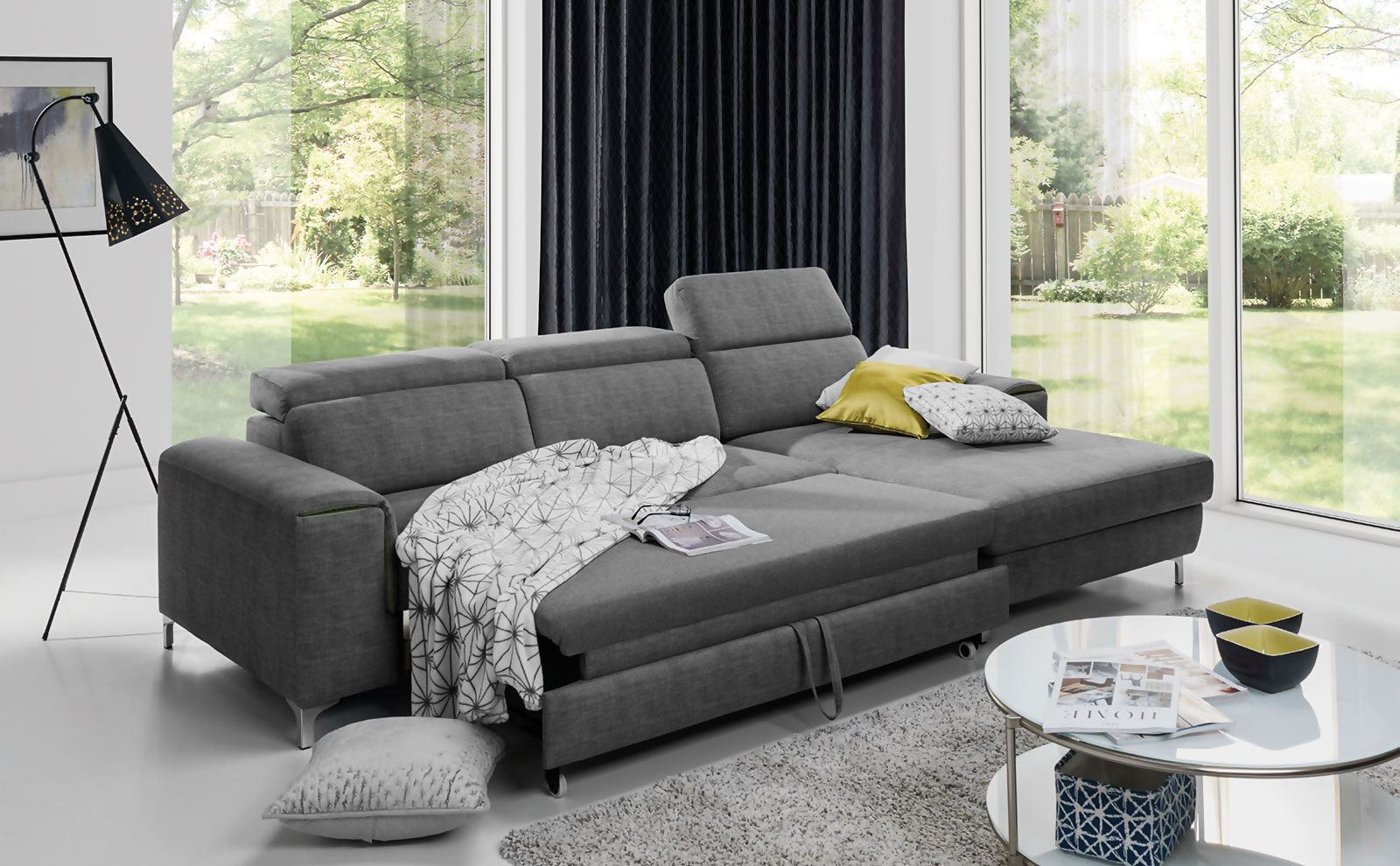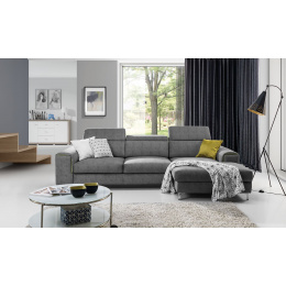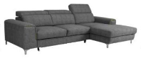 Moderní, pohodlná rohová sedací souprava. Sedačka je rozkládací s úložným prostorem. Rohovka je vybavená moderními nastavitelnými opěrkami hlavy. Má kovové nožičky. Sedáky jsou vyplněny pružinovými vlnovci a odolnou PUR pěnou. Velký výběr potahových látek s povrchovou úpravou Aqua Clean.