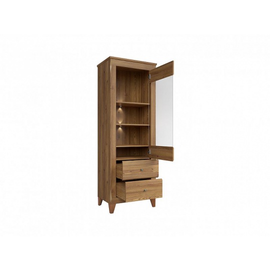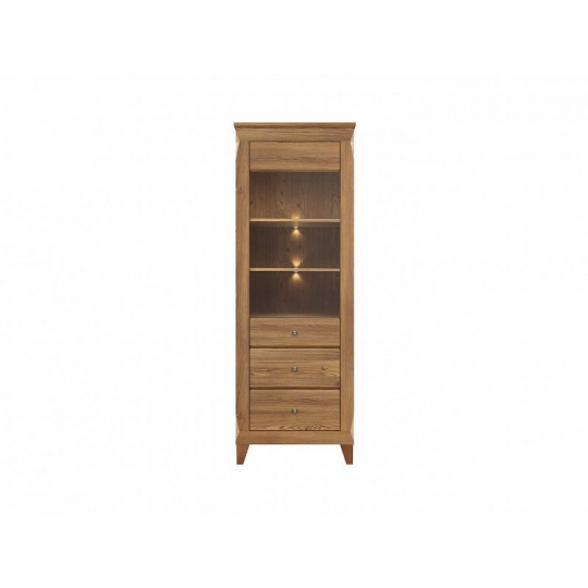 Vitrína REG1W2S ze sektoru BERGEN - dvě poličky za proskleným dvířkem jsou doplněny LED osvětlením. Zásuvky jsou umístěny na pojezdech HETTICH Quadro Silent System s tlumeným dojezdem. Panty FGV s brzdou.