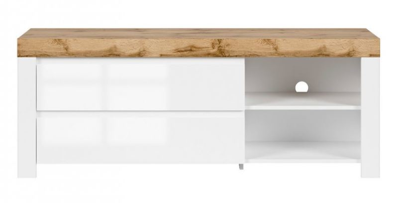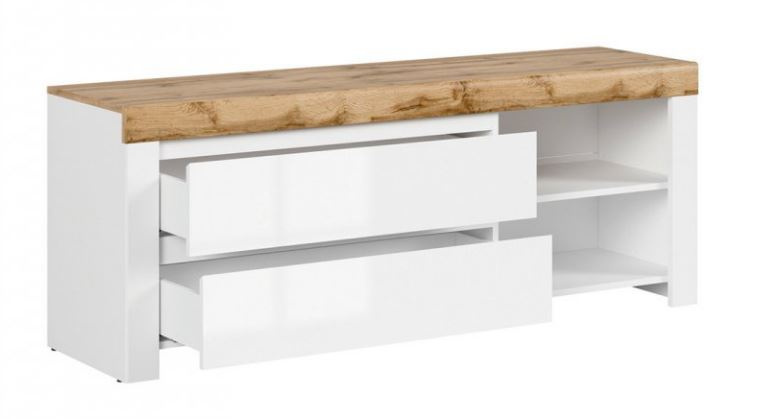 Stolek pod televizi HOLTEN - s objemnými šuplíky a otevřenou odkládací nikou s poličkou.