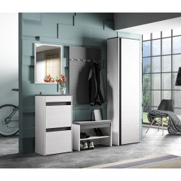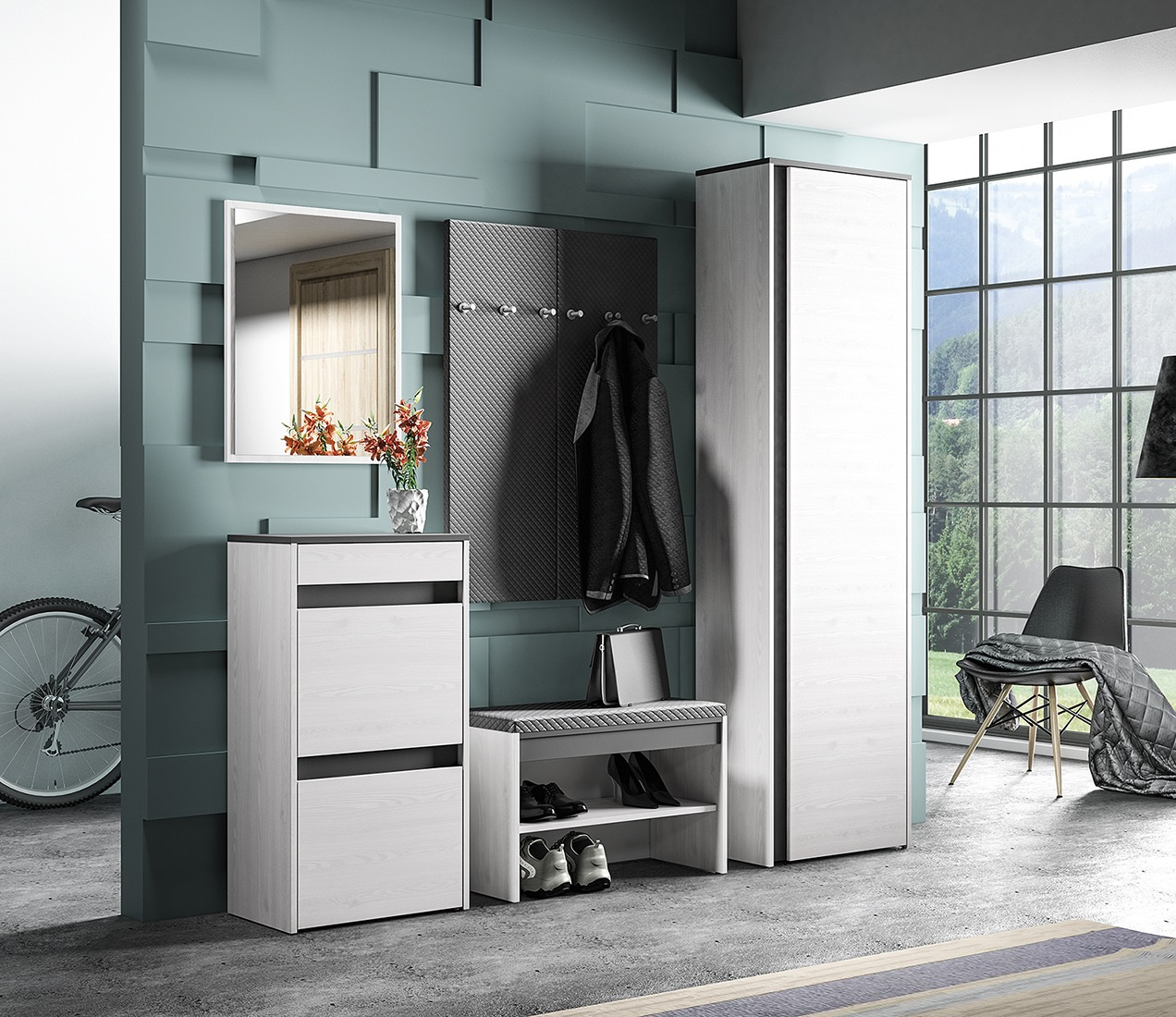 HYGA je moderní systémový nábytek do předsíně. Minimalistické, hladké tvary jsou ideální pro malý i velký interiér. Kontrastní kombinace dekorů, bílá borovice / antracit - zdůrazňuji charakter nábytku a dodávají mu lehkost. Šedé prošívané čalounění věšáku a sedáku dodává nábytku nadčasovou eleganci a zajišťuje komfort při jeho užívání.