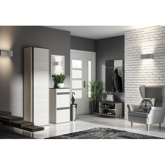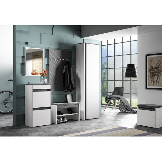 HYGA je moderní systémový nábytek do předsíně. Minimalistické, hladké tvary jsou ideální pro malý i velký interiér. Kontrastní kombinace dekorů, bílá borovice / antracit - zdůrazňuji charakter nábytku a dodávají mu lehkost. Šedé prošívané čalounění věšáku a sedáku u botníku dodává nábytku nadčasovou eleganci a zajišťuje komfort při jeho užívání.