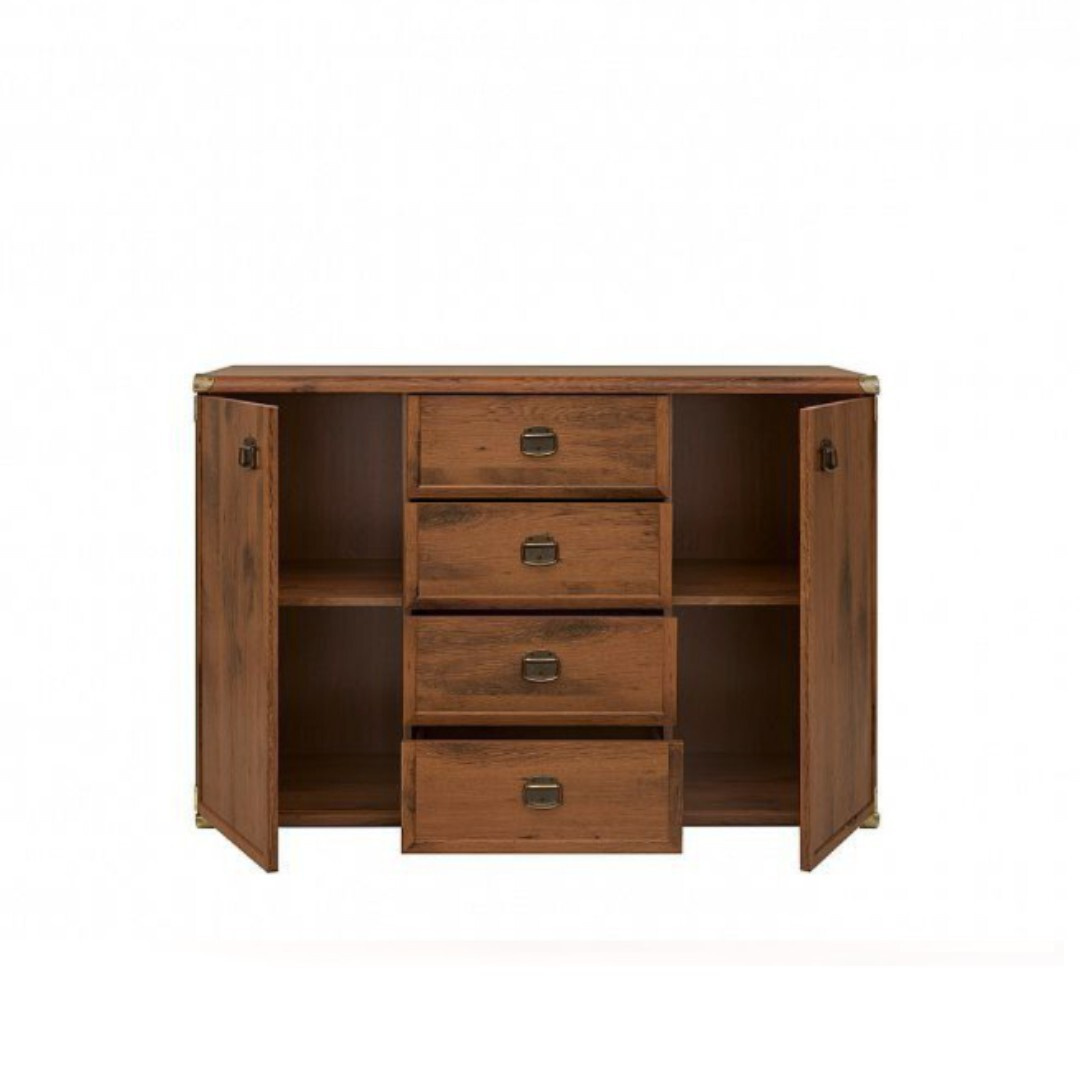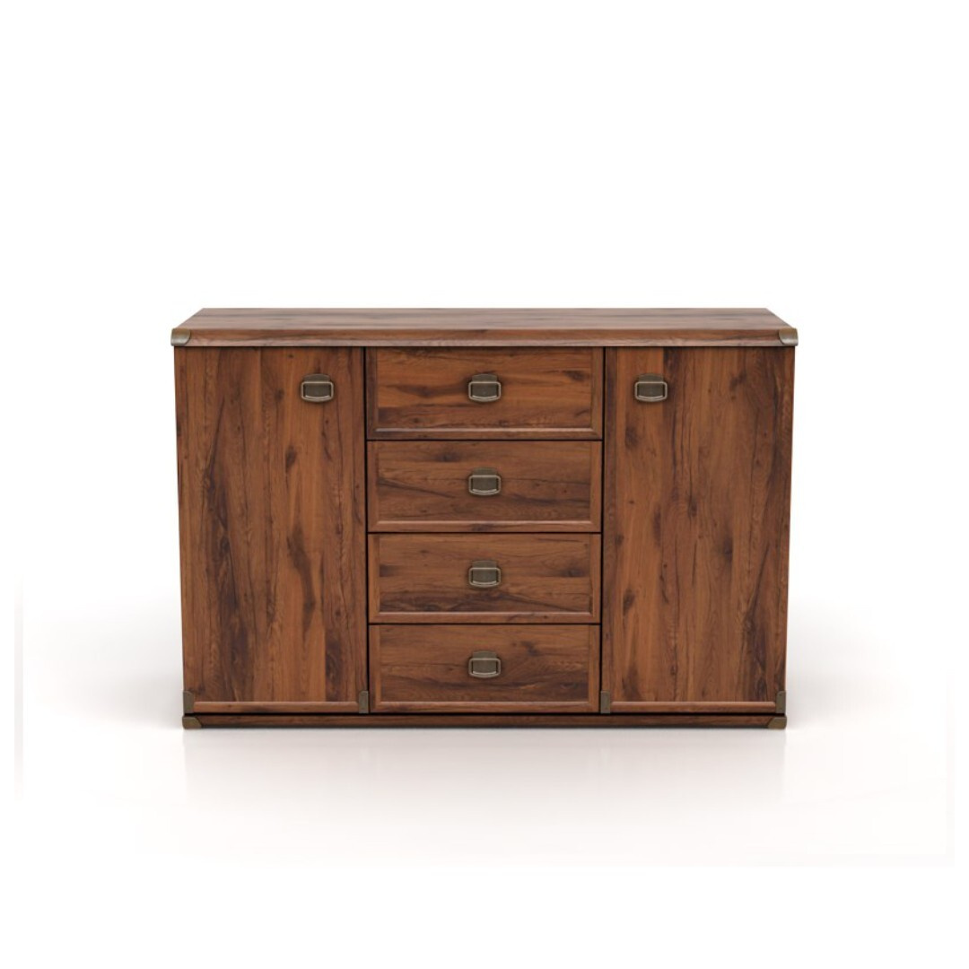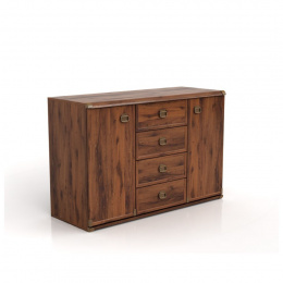 Komoda JKOM2D4S ze systému INDIANA - po stranách plná dvířka za kterými jsou po jedné polici, uprostřed čtyři šuplíky na válečkových kolejničkách