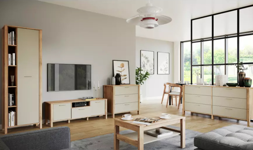 Moderní systémový nábytek INDYGO, vhodný do obývacího pokoje, ložnice i studentského pokoje. Nábytek je vyroben z kvalitního lamina. Korpus v teplém zlatém odstínu dub wotan, hladké čelní plochy dvířek a šuplíků jsou v jednobarevné zelené nebo béžové barvě. Jednoduchá ozdobná lišta plynule přechází do vysokých nožiček nábytku. Minimalistická kovová úchytka skvěle doplní celkový design sektoru INDYGO.