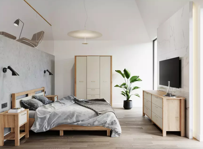 Moderní systémový nábytek INDYGO, vhodný do obývacího pokoje, ložnice i studentského pokoje. Nábytek je vyroben z kvalitního lamina. Korpus v teplém zlatém odstínu dub wotan, hladké čelní plochy dvířek a šuplíků jsou v jednobarevné zelené nebo béžové barvě. Jednoduchá ozdobná lišta plynule přechází do vysokých nožiček nábytku. Minimalistická kovová úchytka skvěle doplní celkový design sektoru INDYGO.