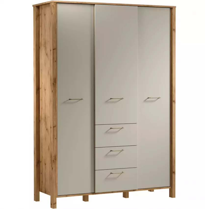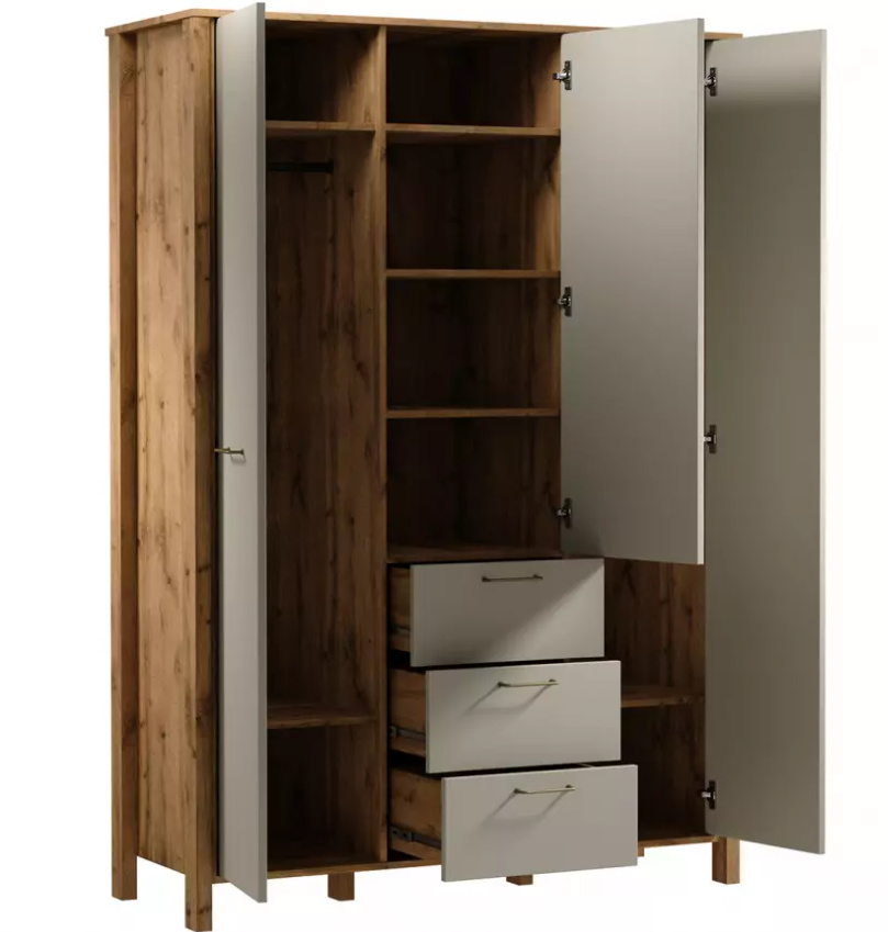 Šatní skříň S3D3S ze systému INDYGO - třídveřová s šatní tyčí, policemi a šuplíky