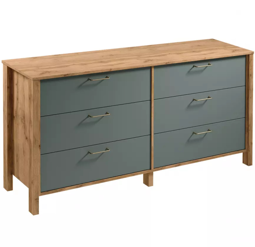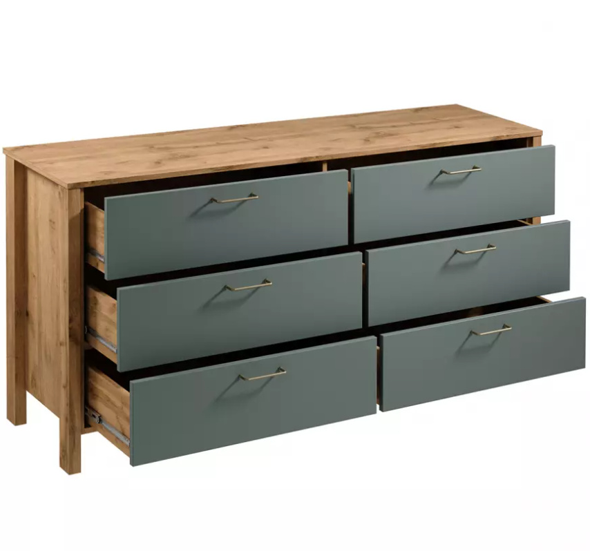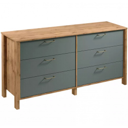 Moderní systémový nábytek INDYGO, vhodný do obývacího pokoje, ložnice i studentského pokoje. Nábytek je vyroben z kvalitního lamina. Korpus v teplém zlatém odstínu dub wotan, hladké čelní plochy dvířek a šuplíků jsou v jednobarevné zelené nebo béžové barvě. Jednoduchá ozdobná lišta plynule přechází do vysokých nožiček nábytku. Minimalistická kovová úchytka skvěle doplní celkový design sektoru INDYGO.
