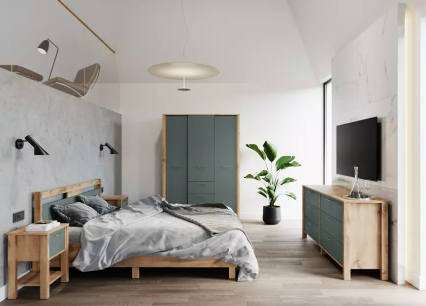 Moderní systémový nábytek INDYGO, vhodný do obývacího pokoje, ložnice i studentského pokoje. Nábytek je vyroben z kvalitního lamina. Korpus v teplém zlatém odstínu dub wotan, hladké čelní plochy dvířek a šuplíků jsou v jednobarevné zelené nebo béžové barvě. Jednoduchá ozdobná lišta plynule přechází do vysokých nožiček nábytku. Minimalistická kovová úchytka skvěle doplní celkový design sektoru INDYGO.