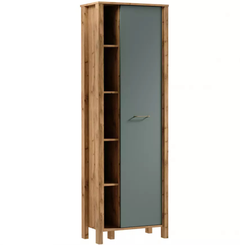 Moderní systémový nábytek INDYGO, vhodný do obývacího pokoje, ložnice i studentského pokoje. Nábytek je vyroben z kvalitního lamina. Korpus v teplém zlatém odstínu dub wotan, hladké čelní plochy dvířek a šuplíků jsou v jednobarevné zelené nebo béžové barvě. Jednoduchá ozdobná lišta plynule přechází do vysokých nožiček nábytku. Minimalistická kovová úchytka skvěle doplní celkový design sektoru INDYGO.