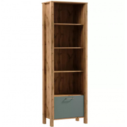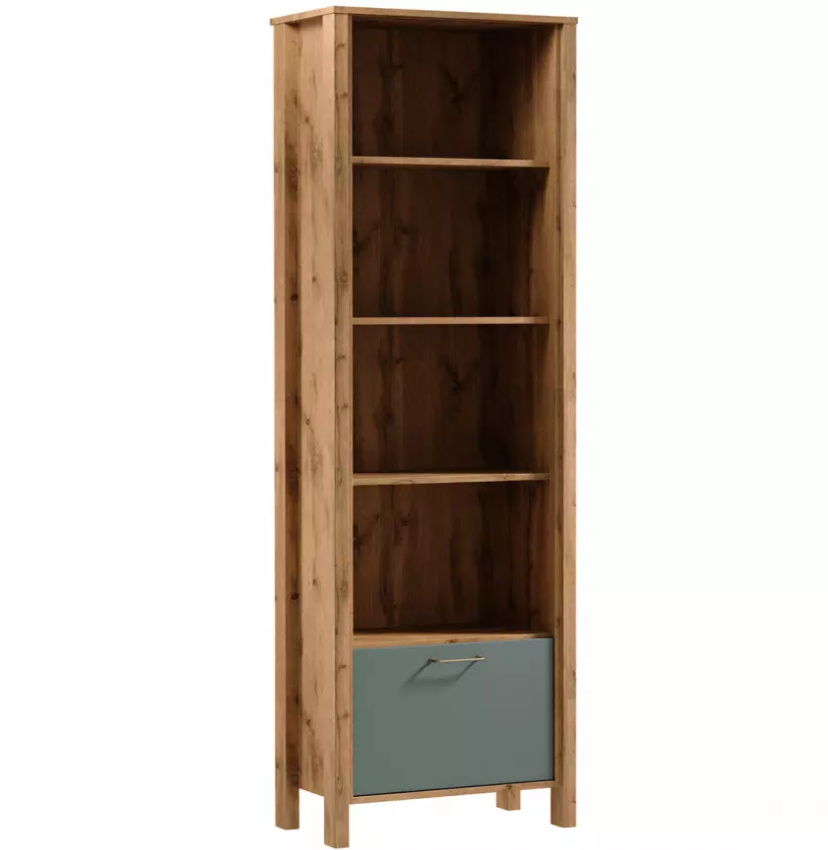 Moderní systémový nábytek INDYGO, vhodný do obývacího pokoje, ložnice i studentského pokoje. Nábytek je vyroben z kvalitního lamina. Korpus v teplém zlatém odstínu dub wotan, hladké čelní plochy dvířek a šuplíků jsou v jednobarevné zelené nebo béžové barvě. Jednoduchá ozdobná lišta plynule přechází do vysokých nožiček nábytku. Minimalistická kovová úchytka skvěle doplní celkový design sektoru INDYGO.