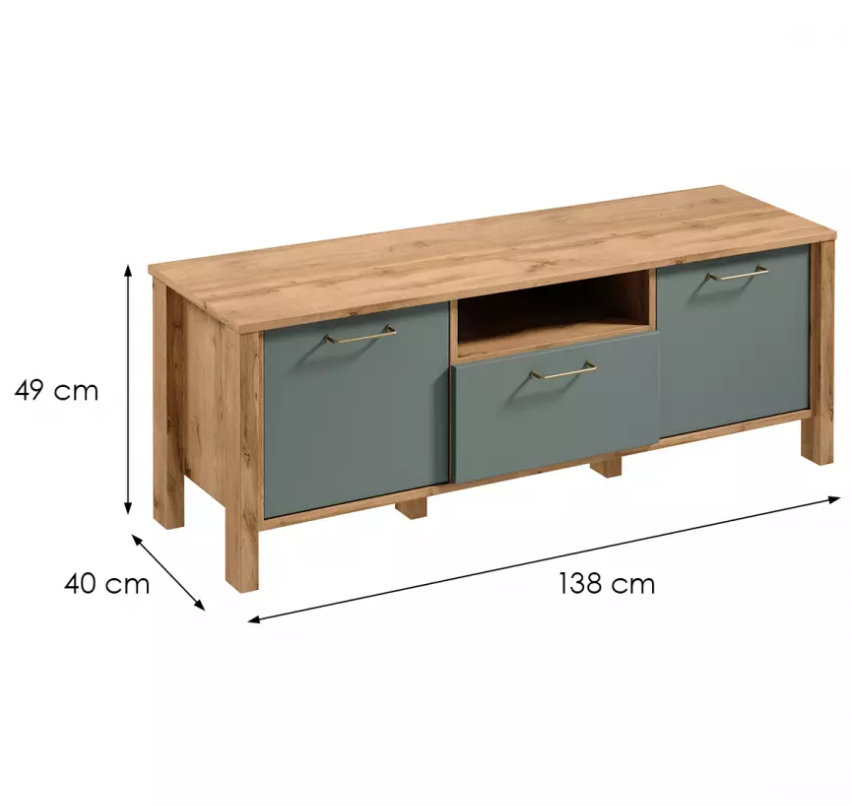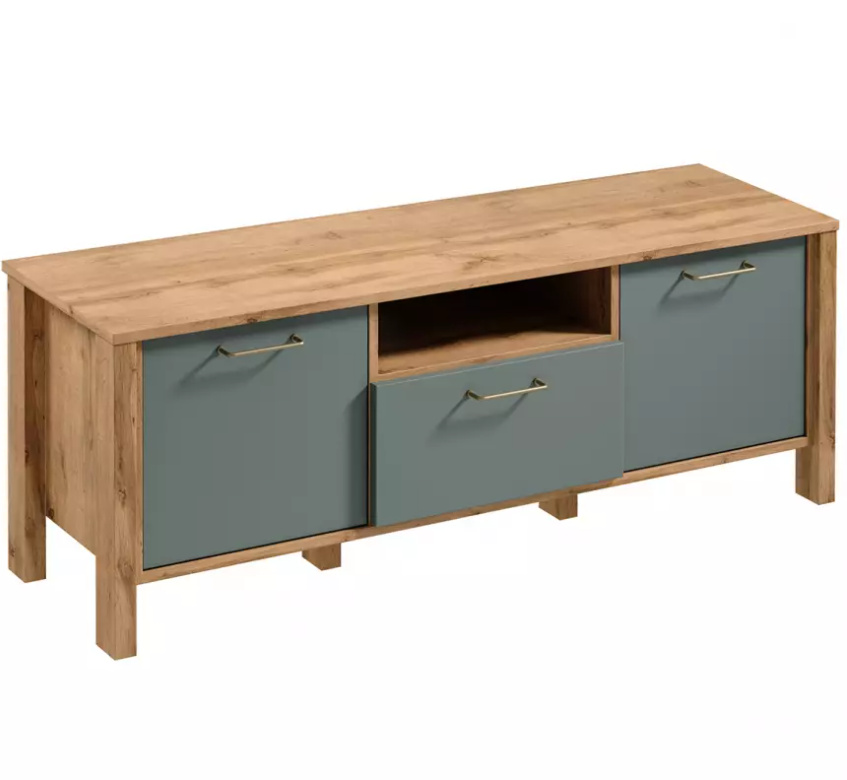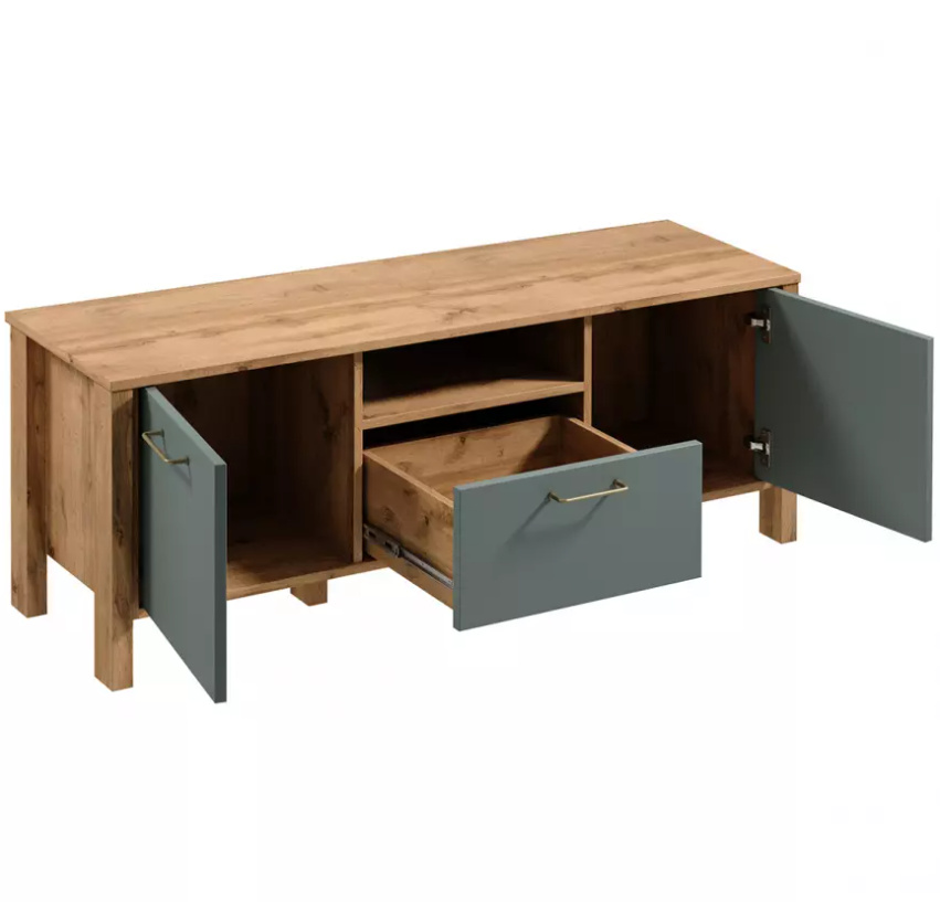 Televizní stolek RTV1S ze systému INDYGO - po stranách plná dvířka, uprostřed šuplík a otevřená odkládací nika