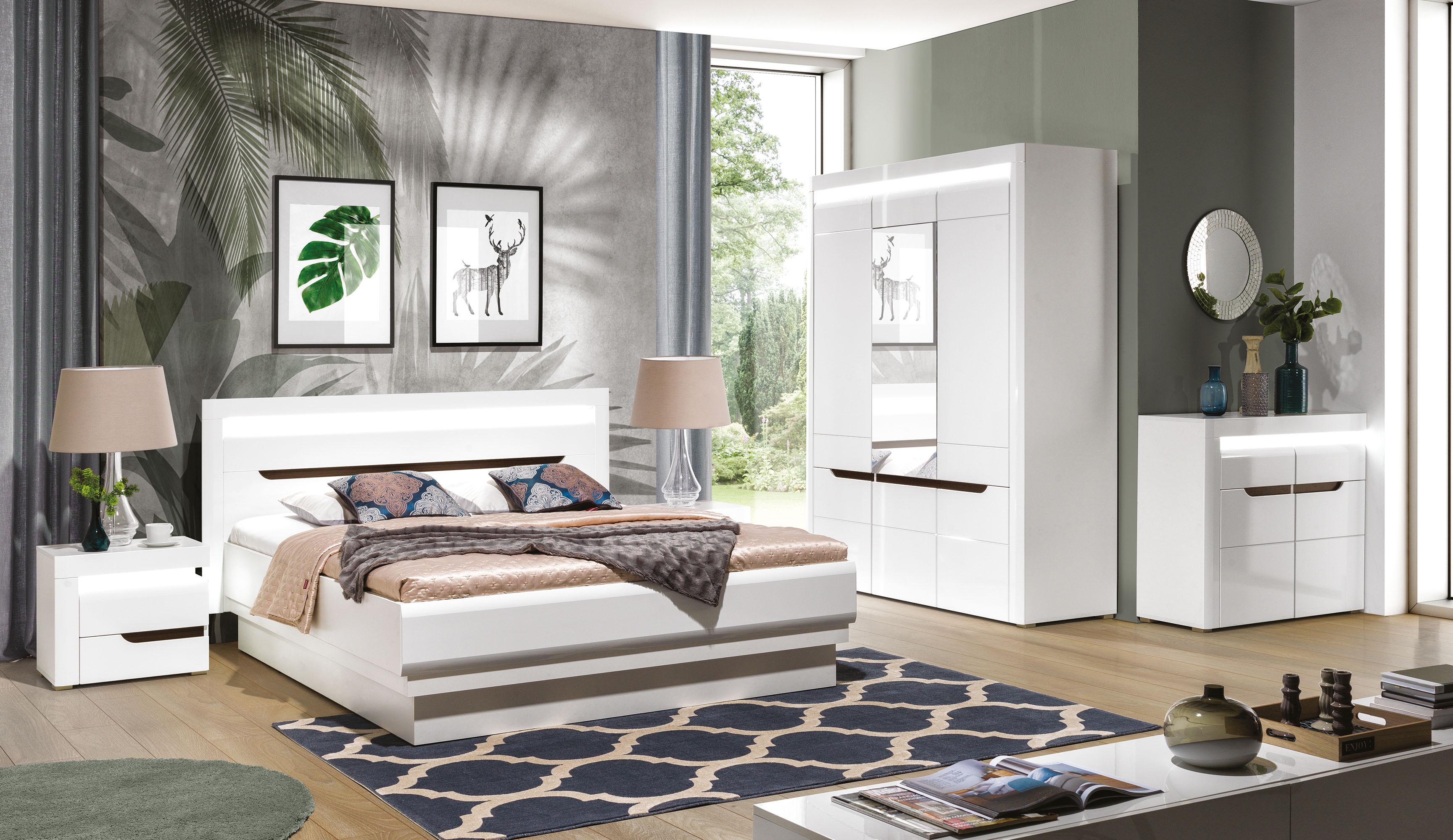 IRMA je moderní a elegantní nábytek s čelními plochami ve vysokém lesku, vnějším LED osvětlením, tiché dovírání dvířek. Korpusy nábytku jsou vyrobeny z kvalitního lamina v bílé barvě, čelní plochy skříněk a šuplíků jsou z foliované MDF bílé barvy s vysokým leskem. Z tohoto systémového nábytku můžete zařídit obývací pokoj, jídelnu i ložnici.