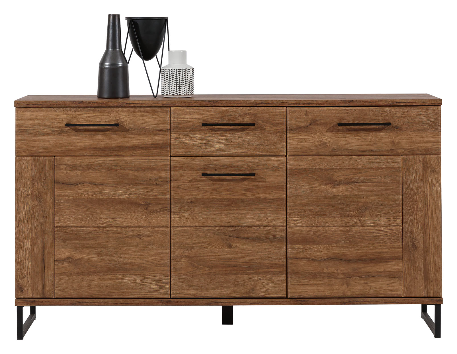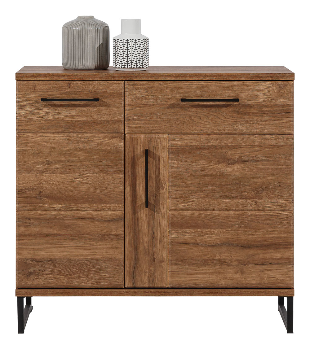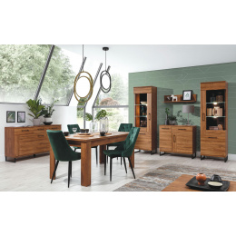 Atraktivní nábytkový systém IVO se vyrábí z kvalitního lamina v dezénu dub april. Dřevěný dekor v kombinaci s černými kovovými detaily působí masivním, ale elegantním dojmem. V nabídce máte 13 jednotlivých prvků, ze kterých můžete vytvořit obývací pokoj i jídelnu. Korpusy sektoru IVO mají sílu lamina 16 mm, vrchní desky 22 mm a hrany chrání ABS 0,5 mm a 1,5 mm. Dvířka, se systémem tichého dovírání a šuplíky s kuličkovými pojezdy s plným vysunutím, jsou z MDF o síle 18 mm potažené PVC folií. Nožičky a úchytky jsou kovové, čelní skla jsou tvrzená. LED podsvícení skleněných polic jsou součásti každé vitríny.