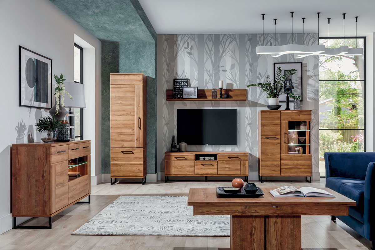 Atraktivní nábytkový systém IVO se vyrábí z kvalitního lamina v dezénu dub april. Dřevěný dekor v kombinaci s černými kovovými detaily působí masivním, ale elegantním dojmem. V nabídce máte 13 jednotlivých prvků, ze kterých můžete vytvořit obývací pokoj i jídelnu. Korpusy sektoru IVO mají sílu lamina 16 mm, vrchní desky 22 mm a hrany chrání ABS 0,5 mm a 1,5 mm. Dvířka, se systémem tichého dovírání a šuplíky s kuličkovými pojezdy s plným vysunutím, jsou z MDF o síle 18 mm potažené PVC folií. Nožičky a úchytky jsou kovové, čelní skla jsou tvrzená. LED podsvícení skleněných polic jsou součásti každé vitríny.