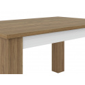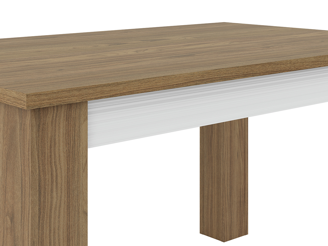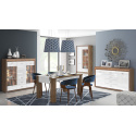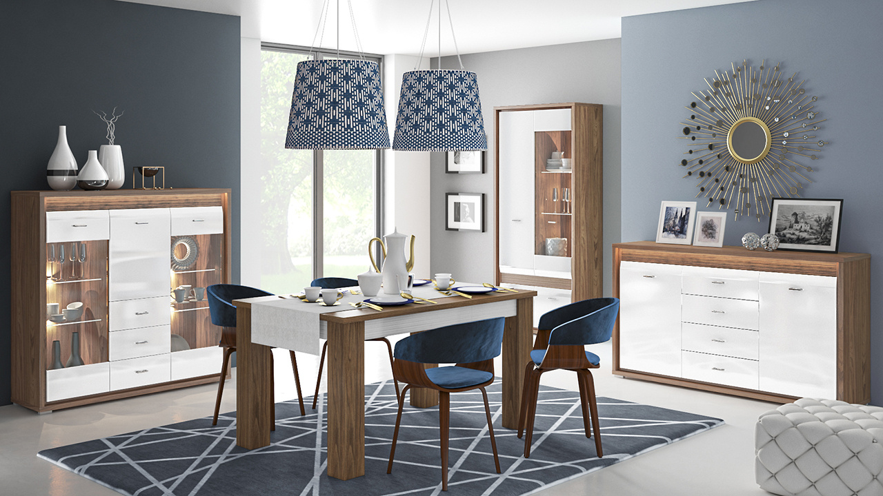 Luxusní systémový nábytek Dallas má pečlivě vybraný dekor přírodního ořechu s čelními plochami v bílém lesku, které přinášejí eleganci a svěžest do Vašeho bytu. Nábytkový systém Dallas je charakteristický horním zaoblením dvířek v MDF folii, které svým tvarem zdůrazňují jeho jedinečnost. Dalším atraktivním detailem je rýhovaná lišta horní lišta, která si můžete vybrat ve dvou odstínech - bílá nebo ořech, která je u komod a televizních stolků, s LED nasvícením. Celkový exkluzivní dojem je doplněn kovovými úchyty. Volbou nábytku DALLAS dodáte Svému interiéru eleganci a exkluzivitu.
