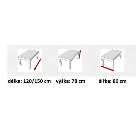 Rozměry: stolová deska - 120 x 80cm, po rozložení 150 cm, výška - 78 cm