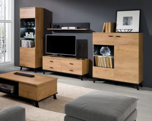 Extravagantní nábytkový systém vytváří originální prvky do moderního obývacího pokoje. Nábytek je na černých nožičkách, které jsou 12 cm vysoké. Moderní sektor JOHN II se vyrábí z kvalitního lamina o síle 16 mm odolného proti poškrábání, vlhkosti a vysokým teplotám, ohraněné PVC dýhou. Úchytky jsou z plastu. Nábytek nabízíme v dekoru dub lefkas. Tento nábytkový systém se skládá z 10 dílů, které můžete libovolně kombinovat a vytvořit si tak obývací pokoj podle svých představ. Ve vitrínách jsou skleněné police, které je možno doplnit LED osvětlením. Skleněné výplně dvířek jsou z tvrzeného skla. Šuplíky mají kuličkové pojezdy.