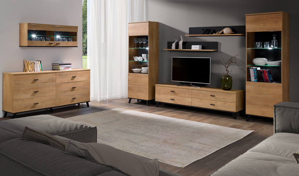 Extravagantní nábytkový systém vytváří originální prvky do moderního obývacího pokoje. Nábytek je na černých nožičkách, které jsou 12 cm vysoké. Moderní sektor JOHN II se vyrábí z kvalitního lamina o síle 16 mm odolného proti poškrábání, vlhkosti a vysokým teplotám, ohraněné PVC dýhou. Úchytky jsou z plastu. Nábytek nabízíme v dekoru dub lefkas. Tento nábytkový systém se skládá z 10 dílů, které můžete libovolně kombinovat a vytvořit si tak obývací pokoj podle svých představ. Ve vitrínách jsou skleněné police, které je možno doplnit LED osvětlením. Skleněné výplně dvířek jsou z tvrzeného skla. Šuplíky mají kuličkové pojezdy.