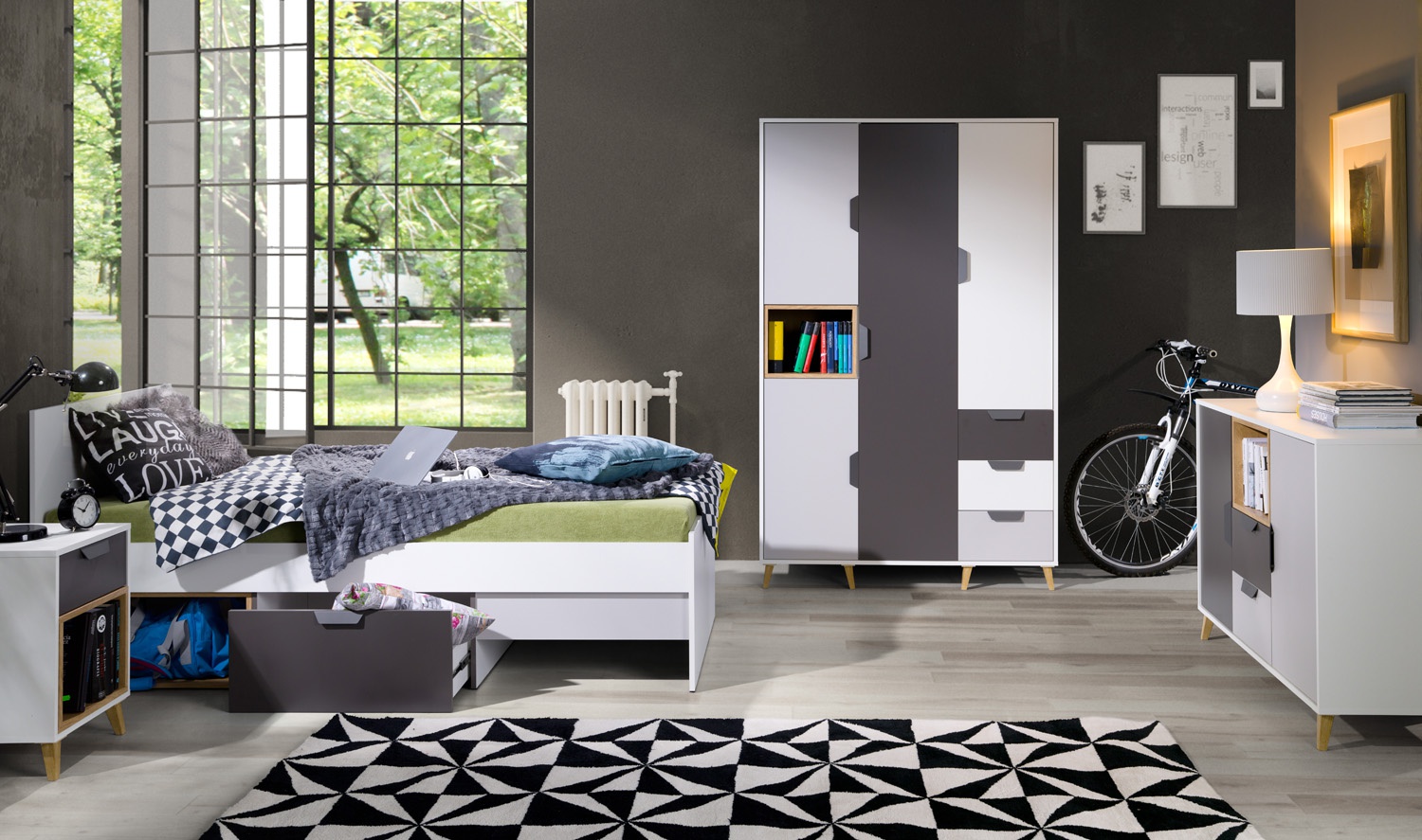 Systémový nábytek JOKER - ideální varianta pro Vašeho teenagera. Nábytek navržený v souladu s aktuálními trendy designu. Kombinace moderních barev a funkčnosti každého kusu nábytku poskytne pohodlí a ideální prostor pro učení. Studentský pokoj JOKER je v kombinací módních barev grafitu, šedé, bílé a dubu Lefkas což podtrhuje charakter nábytku. Sektorový nábytek JOKER tvoří 15 prvků, které můžete libovolně kombinovat. Díky čemu si můžete sestavit pokoj podle svých představ. Nábytek JOKER je vyroben z kvalitního lamina, hrany jsou začištěny ABS hranou, pojezdy jsou kovové, nožičky z plastu v dekoru dřeva a úchyty plastové v šedé barvě.