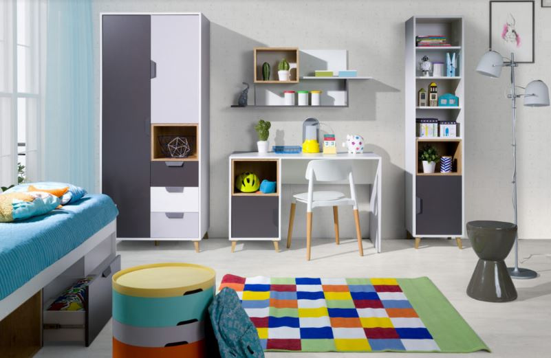 Systémový nábytek JOKER - ideální varianta pro Vašeho teenagera. Nábytek navržený v souladu s aktuálními trendy designu. Kombinace moderních barev a funkčnosti každého kusu nábytku poskytne pohodlí a ideální prostor pro učení. Studentský pokoj JOKER je v kombinací módních barev grafitu, šedé, bílé a dubu Lefkas což podtrhuje charakter nábytku. Sektorový nábytek JOKER tvoří 15 prvků, které můžete libovolně kombinovat. Díky čemu si můžete sestavit pokoj podle svých představ. Nábytek JOKER je vyroben z kvalitního lamina, hrany jsou začištěny ABS hranou, pojezdy jsou kovové, nožičky z plastu v dekoru dřeva a úchyty plastové v šedé barvě.