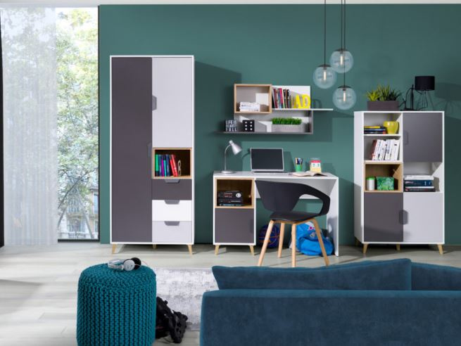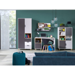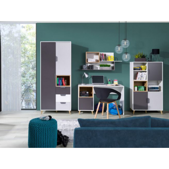 Systémový nábytek JOKER - ideální varianta pro Vašeho teenagera. Nábytek navržený v souladu s aktuálními trendy designu. Kombinace moderních barev a funkčnosti každého kusu nábytku poskytne pohodlí a ideální prostor pro učení. Studentský pokoj JOKER je v kombinací módních barev grafitu, šedé, bílé a dubu Lefkas což podtrhuje charakter nábytku. Sektorový nábytek JOKER tvoří 15 prvků, které můžete libovolně kombinovat. Díky čemu si můžete sestavit pokoj podle svých představ. Nábytek JOKER je vyroben z kvalitního lamina, hrany jsou začištěny ABS hranou, pojezdy jsou kovové, nožičky z plastu v dekoru dřeva a úchyty plastové v šedé barvě.