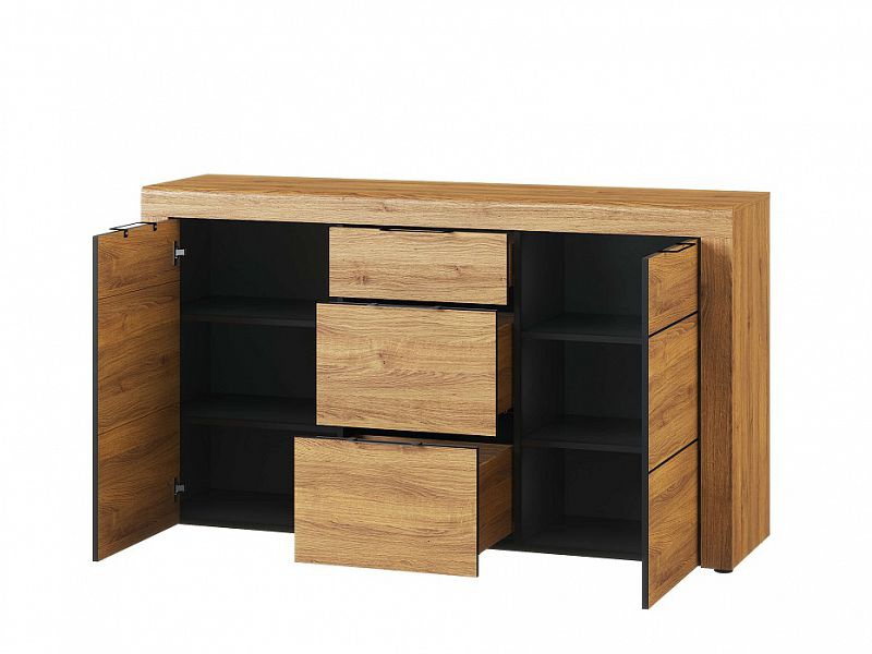KALI je moderní, barevně atraktivní nábytek, kterým skvěle doplníte Váš obývací pokoj i jídelnu. Nábytek je vyroben z kvalitního lamina v barevné kombinaci dub camargue / černý mat. Skříňky nábytkového systému skvěle doplňují kovové úchyty. Jednoduché, hladké linie nábytku KALI, nadčasový design a atraktivní barevné provedení. To vše zajistí dlouhodobý příjemný dojem z Vašeho interiéru.