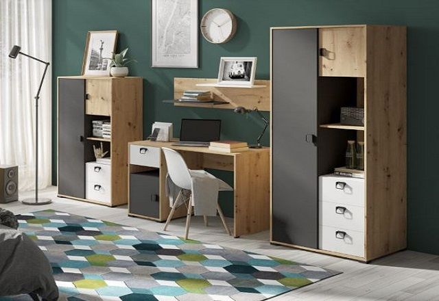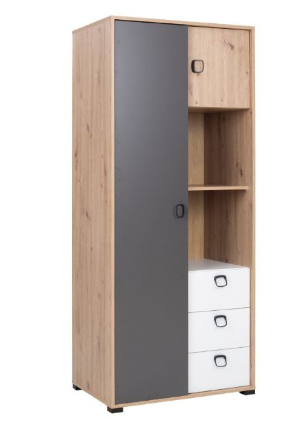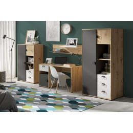 Moderní nábytkový systém KEVIN je navržen podle nejnovějších trendů. Atraktivní barvy nábytku a elegantní tvar úchytů podtrhují jeho jednoduchost. Sektorový nábytek KEVIN je ideální do dětských a studentských pokojůSektor KEVIN je složen z 11 dílů v různých barevných kombinacích. Nábytek je vyroben z kvalitního lamina, které je odolné proti poškrábání a vlhkosti a vysokým teplotám. Sektorový nábytek KEVIN je v barevném provedení dub artisan / grafit / bílá. Kování dvířek a pojezdy šuplíků jsou kovové. Úchyty z plastu v černé barvě.