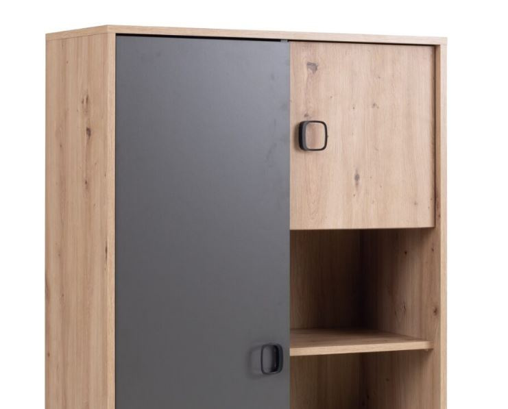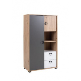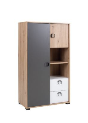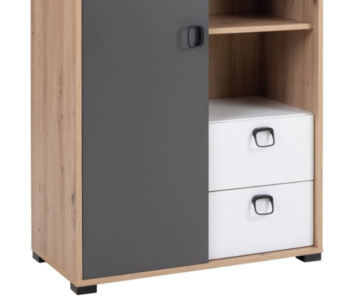 Kombinovaná komoda 4 ze systému KEVIN - částečně uzavřená dvířky, s policemi a šuplíky. Korpus a menší z dvířek v dekoru dub artisan, velká dvířka v provedení grafit, šuplíky v bílé barvě, úchytky v černém plastu.