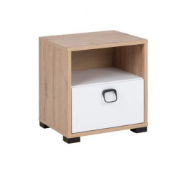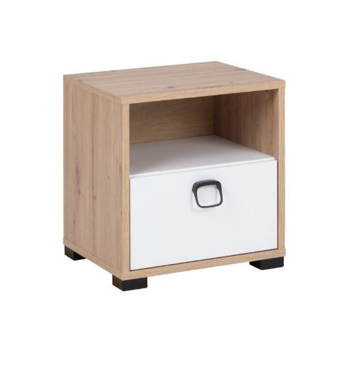Noční stolek 9 ze systému KEVIN - jedno šuplíkový s otevřenou odkládací nikou. Korpus v dekoru dub artisan, šuplík v bílé barvě, úchytky v černém plastu.