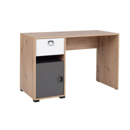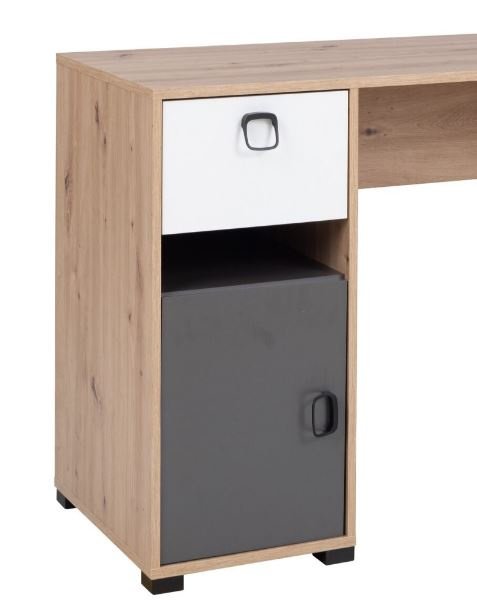 Psací stůl 8 ze systému KEVIN - jedno dvířková s otevřenou nikou, s policemi a šuplíkem. Korpus v dekoru dub artisan, dvířka v provedení grafit, šuplík v bílé barvě, úchytky v černém plastu.