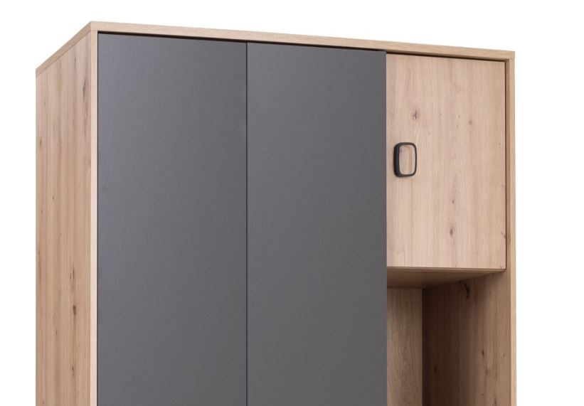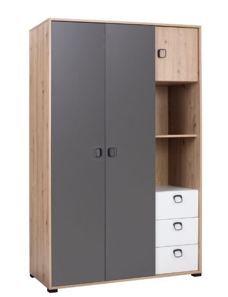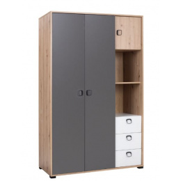 Šatní skříň 1 ze systému KEVIN - kombinovaná s policemi, šuplíky i šatní tyčí. Korpus a jedno z dvířek v dekoru dub artisan, velké dvou dveře v provedení grafit, šuplíky v bílé barvě, úchytky v černém plastu.