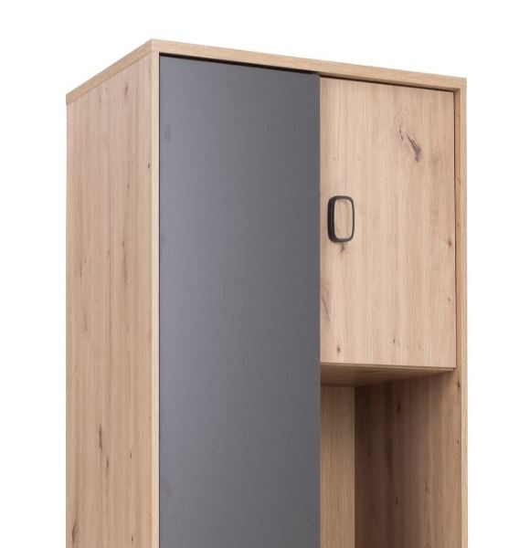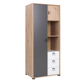 Šatní skříň 2 ze systému KEVIN - kombinovaná s policemi, šuplíky i šatní tyčí. Korpus a jedno z dvířek v dekoru dub artisan, velké dveře v provedení grafit, šuplíky v bílé barvě, úchytky v černém plastu.