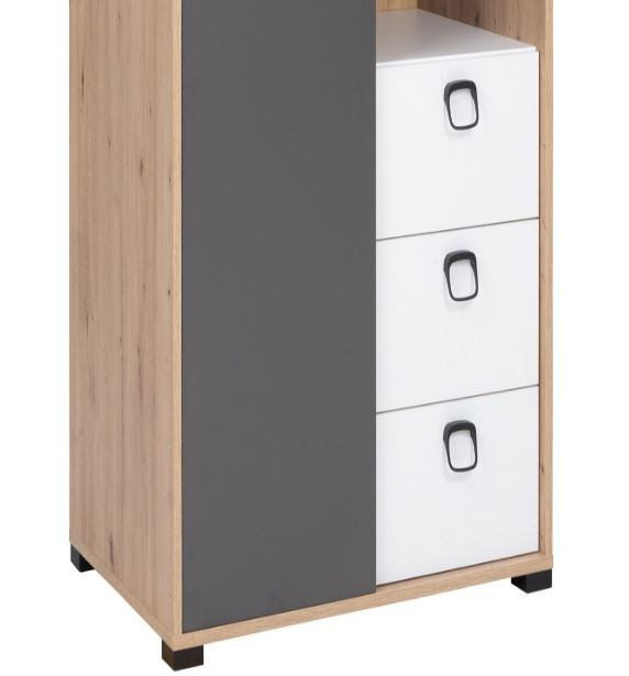 Moderní nábytkový systém KEVIN je navržen podle nejnovějších trendů. Atraktivní barvy nábytku a elegantní tvar úchytů podtrhují jeho jednoduchost. Sektorový nábytek KEVIN je ideální do dětských a studentských pokojů. Sektor KEVIN je složen z 11 dílů v různých barevných kombinacích. Nábytek je vyroben z kvalitního lamina, které je odolné proti poškrábání a vlhkosti a vysokým teplotám. Sektorový nábytek KEVIN je v barevném provedení dub artisan / grafit / bílá. Kování dvířek a pojezdy šuplíků jsou kovové. Úchyty z plastu v černé barvě.