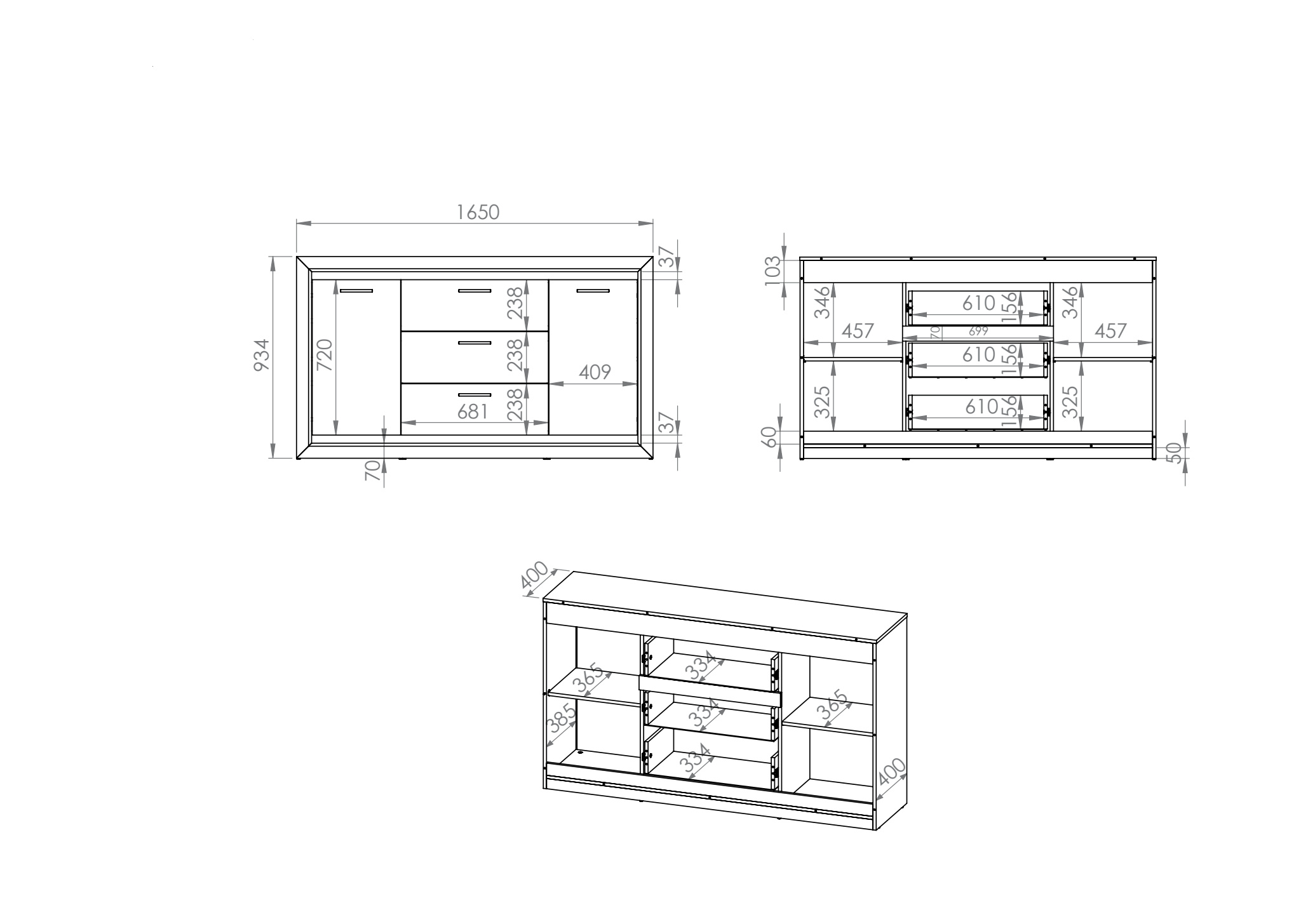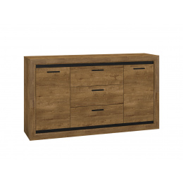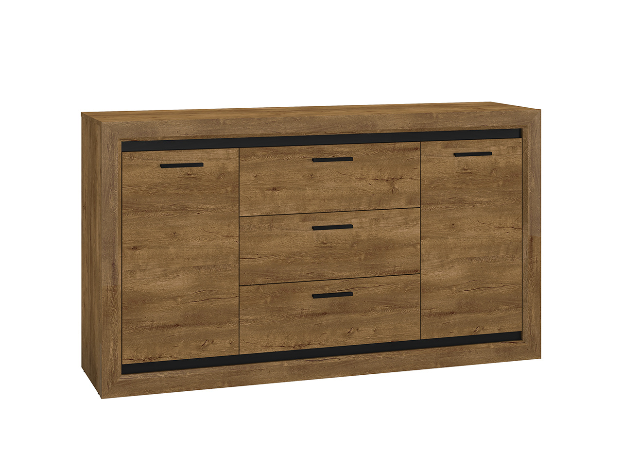 Komoda BALTICA 0801 - po stranách plná dvířka, za kterými je po jedné polici na každé straně, uprostřed jsou tři šuplíky