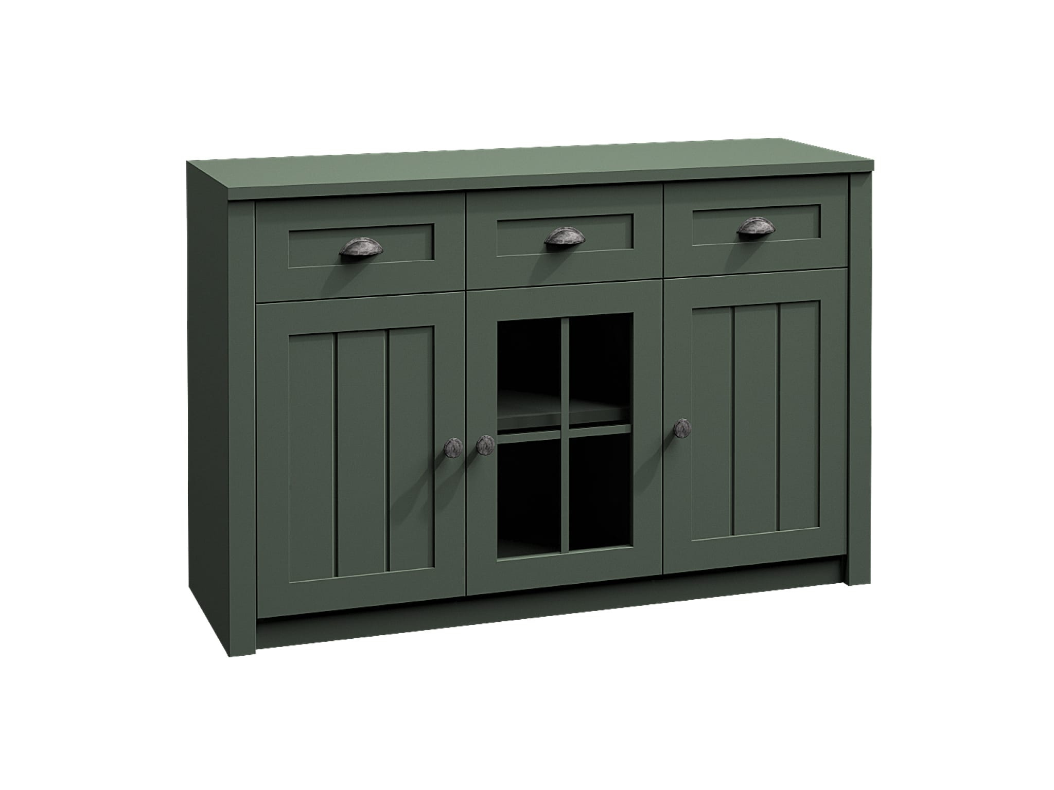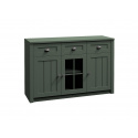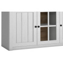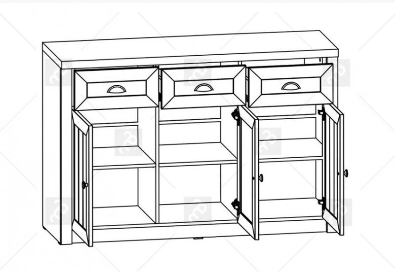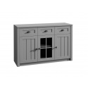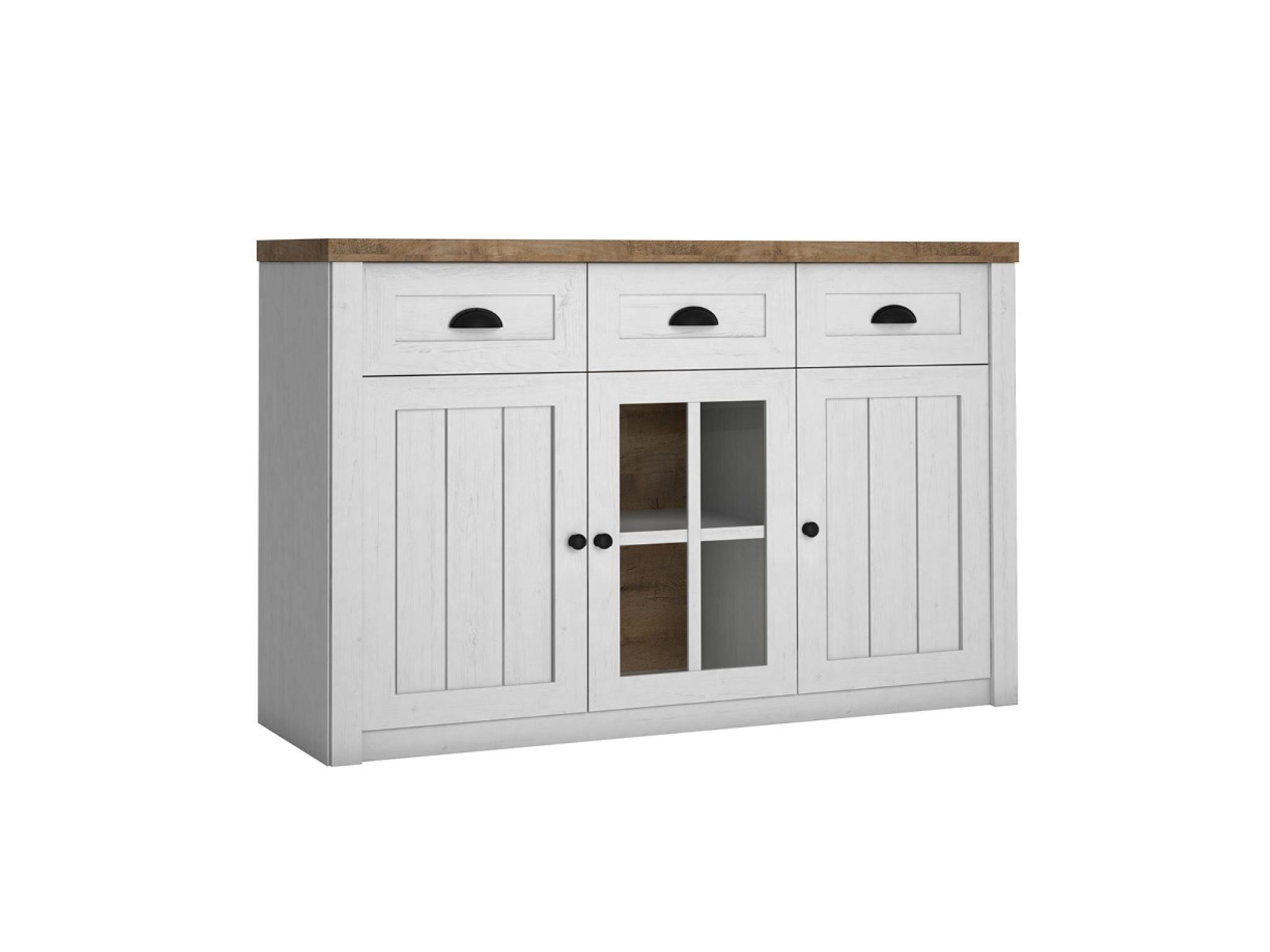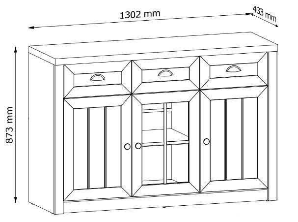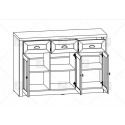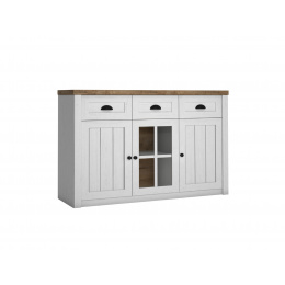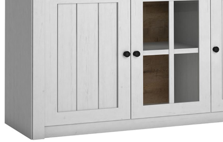 Komoda K3S ze systému PROWANSJA Sosna Andersen - tří dveřová s policemi a třemi šuplíky v horní části, prostřední dvířka jsou prosklená