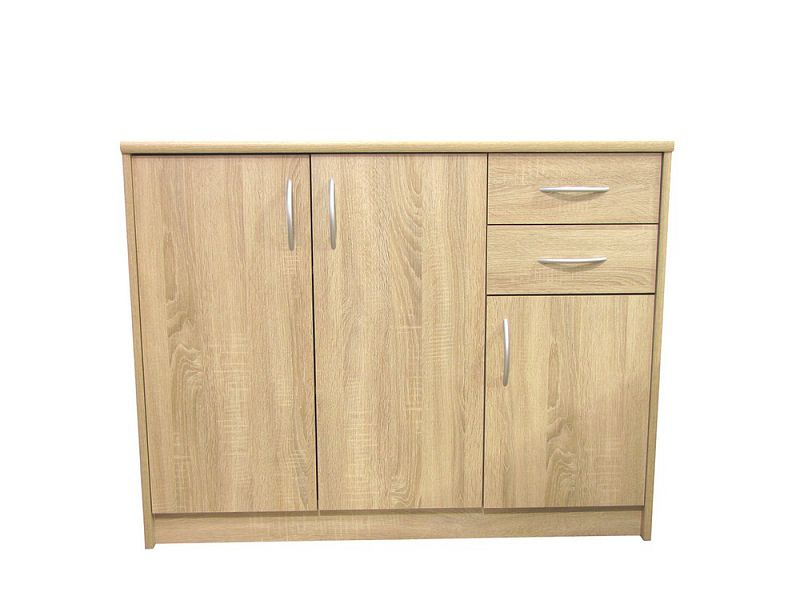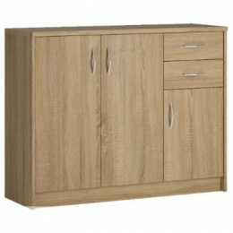 Praktická, jednoduchá komoda Lukáš třídvéřová + police + dvě zásuvky. Je vyrobena z lamina v barvě dub Sonoma o tloušťce 16 mm.