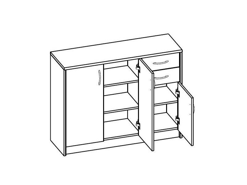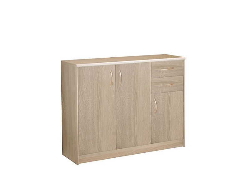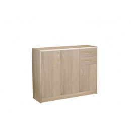 Praktická, jednoduchá komoda Martin třídvéřová + police + dvě zásuvky. Je vyrobena z lamina v barvě dub Sonoma o tloušťce 16 mm.