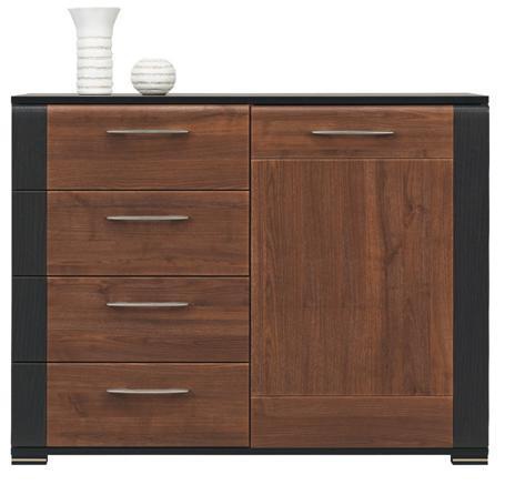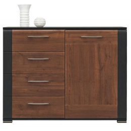 Komoda NA 2 ze ze systému NAOMI - v jedné polovině polici uzavřenou dvířky standartně doplněné tlumicími dorazy. V druhé polovině jsou čtyři šuplíky.