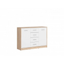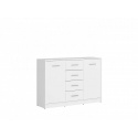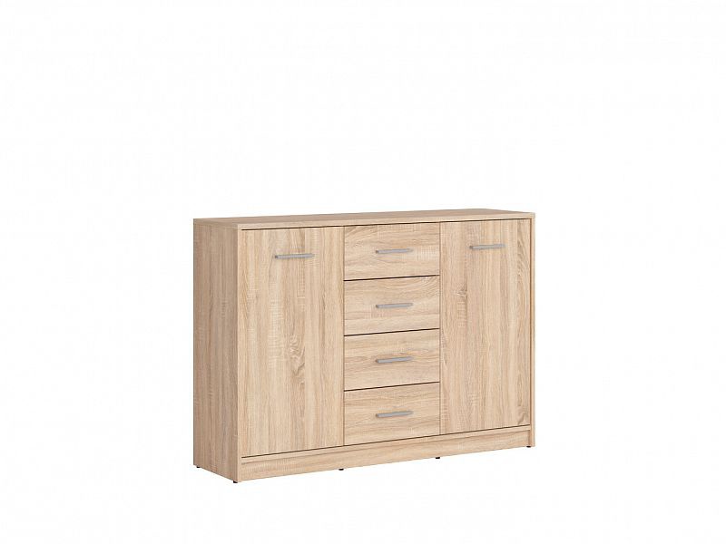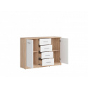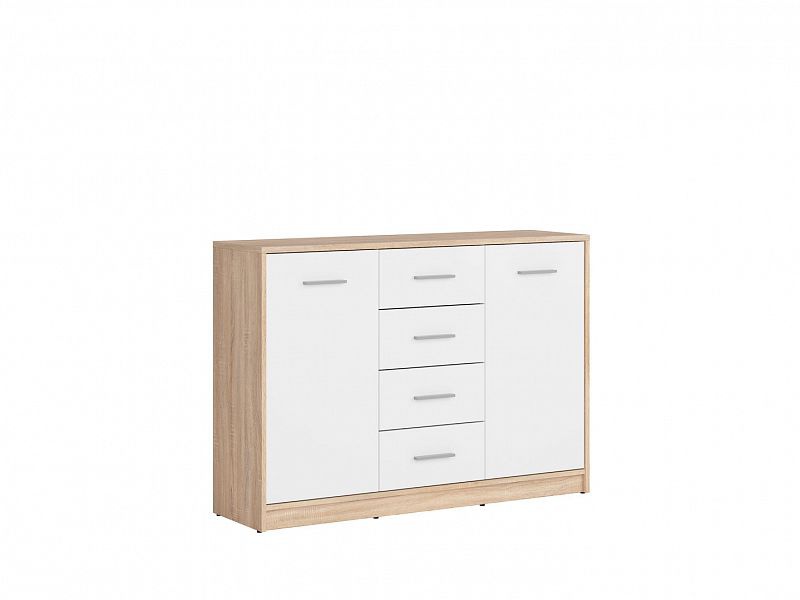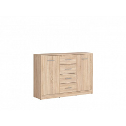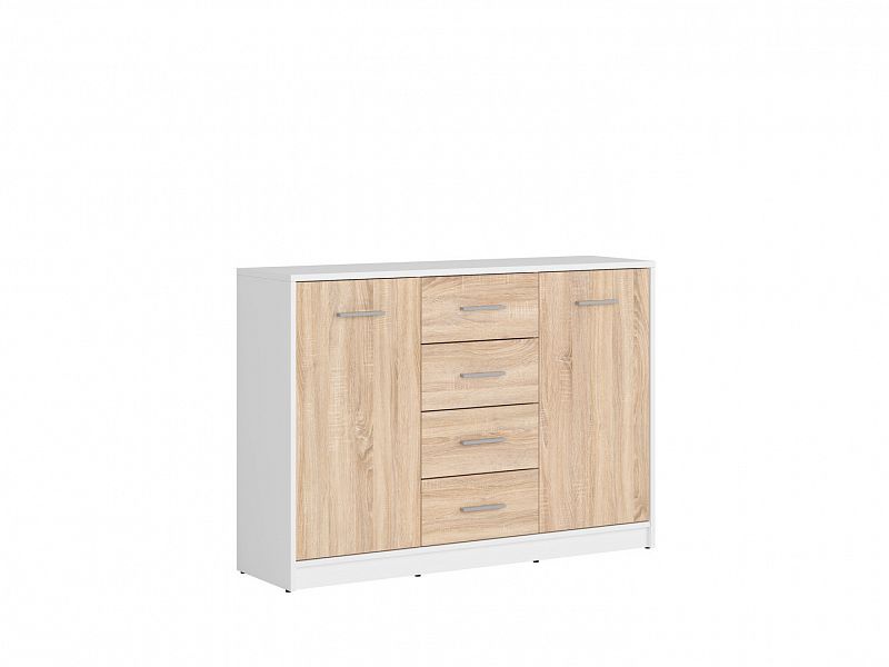 Komoda má 4 zásuvky a 2 skříňky s 1 policí. Zásuvky jsou na válečkových kolejničkách.
