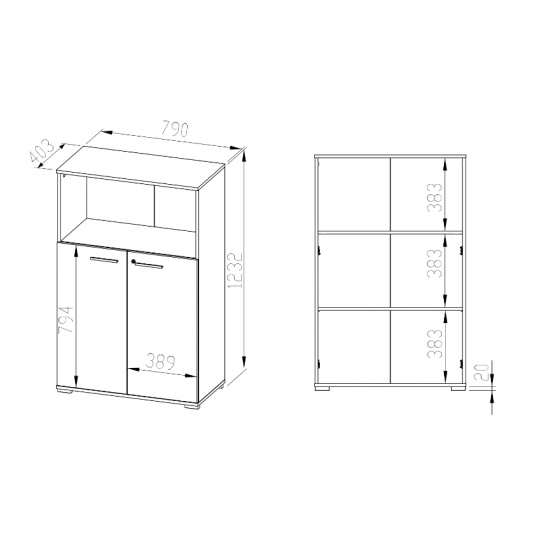 Komoda OPTIMAL 10, s policemi a dvěma plnými dvířky.