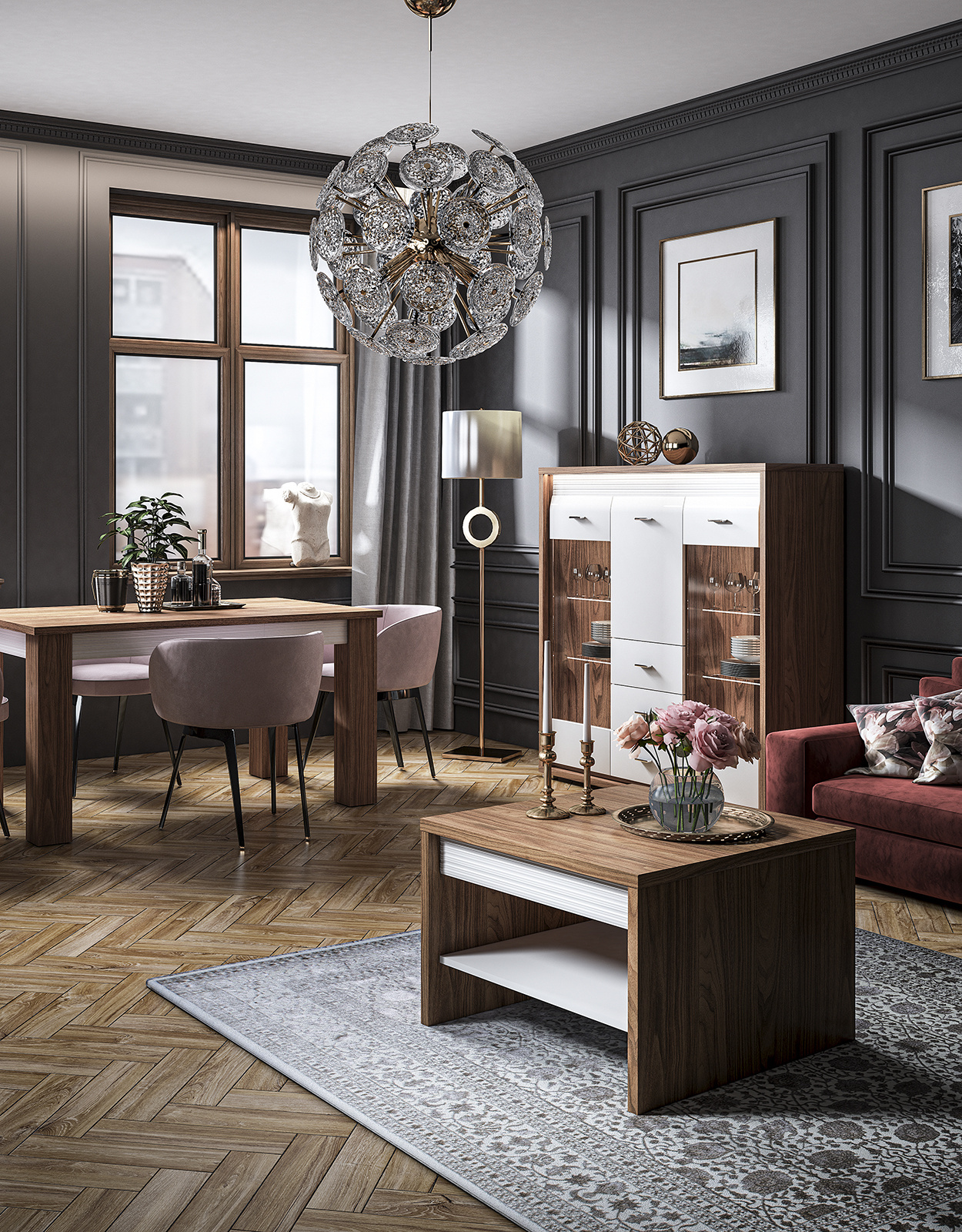 Luxusní systémový nábytek Dallas má pečlivě vybraný dekor přírodního ořechu s čelními plochami v bílém lesku, které přinášejí eleganci a svěžest do Vašeho bytu. Nábytkový systém Dallas je charakteristický horním zaoblením dvířek v MDF folii, které svým tvarem zdůrazňují jeho jedinečnost. Dalším atraktivním detailem je rýhovaná lišta horní lišta, která si můžete vybrat ve dvou odstínech - bílá nebo ořech, která je u komod a televizních stolků, s LED nasvícením. Celkový exkluzivní dojem je doplněn kovovými úchyty. Volbou nábytku DALLAS dodáte Svému interiéru eleganci a exkluzivitu.