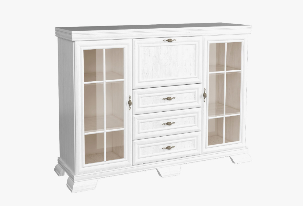 Komoda K K6 ze systému KORA - po stranách má komoda prosklená dvířka a police. Uprostřed jsou tři šuplíky a barová skříňka.