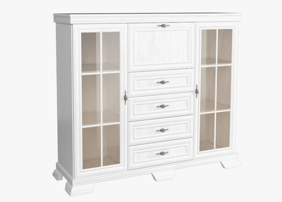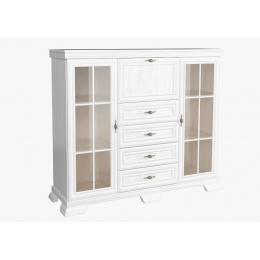Komoda K K7 ze sektoru KORA - po stranách má komoda prosklená dvířka a police. Uprostřed jsou čtyři šuplíky a barová skříňka.