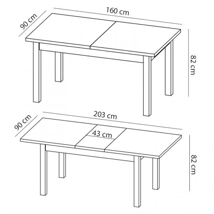 Rozměry: v. 82 cm, stolová deska: 90 x 160 cm, rozklad na 203 cm.