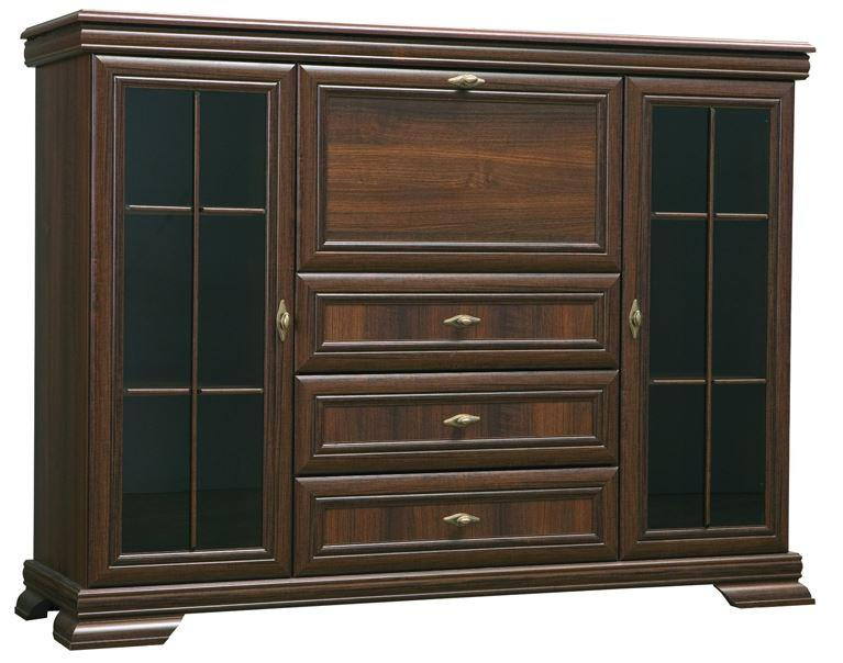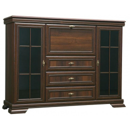 Komoda K K6 ze systému KORA - po stranách má komoda prosklená dvířka a police. Uprostřed jsou tři šuplíky a barová skříňka.